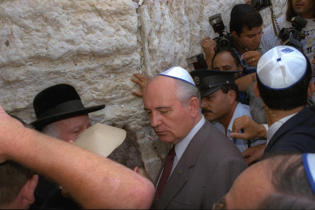 Grobačov s jarmulkou u Zdi nářků 16. června 1992