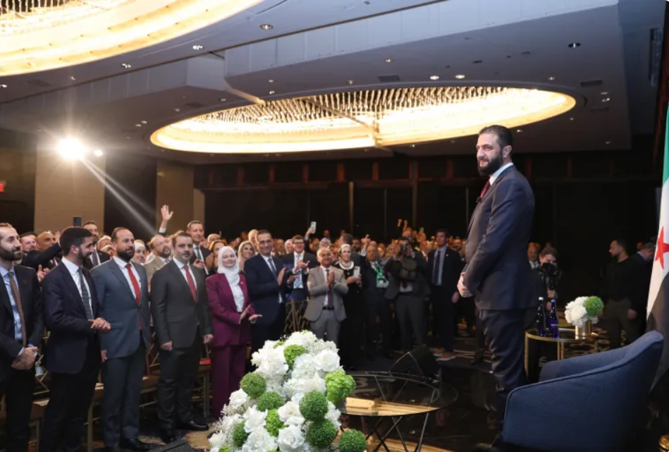 „Prezident Ahmed al-Sharaa se během své návštěvy New Yorku setkal s delegací syrské komunity.“