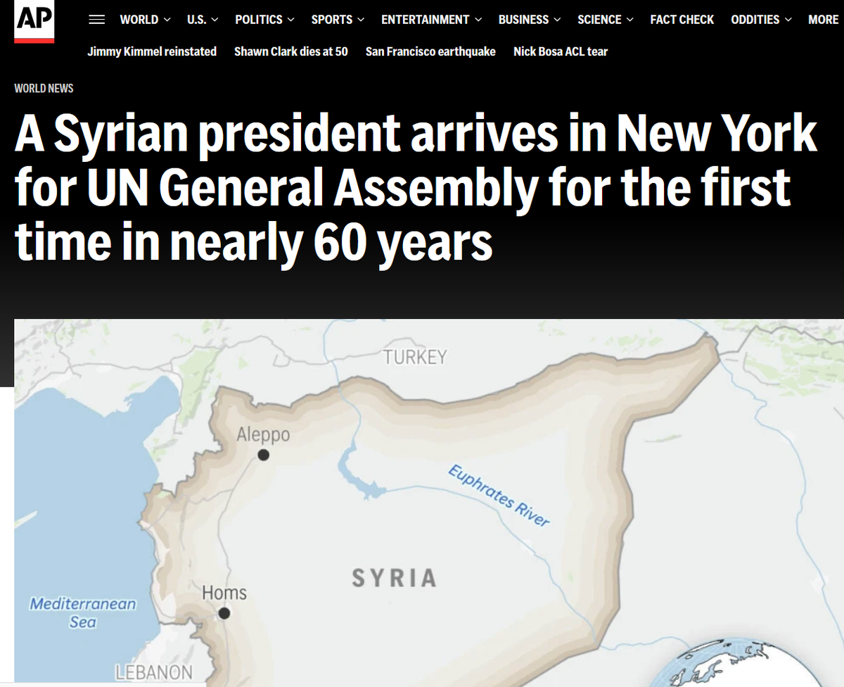 „Naposledy se syrská hlava státu zúčastnila Valného shromáždění v roce 1967. To bylo před 50letou vládou dynastie Asadů, která skončila v prosinci, kdy byl Bašár Asad svržen bleskovou ofenzívou rebelů vedených al-Šaraou. Asadův pád také ukončil téměř 14 let občanské války.