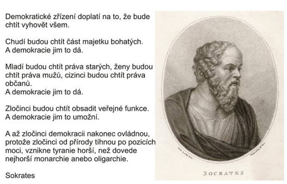 Demokracie je od samého počátku podvod.Tento podvod o pohádce demokracii slouží těm nejhorším z nejhorších. Naši slovanští předkové měli mnohem lepší a dokonalejší řízení a do porad na velkých ,,kupách” byli posíláni pouze ti,co už za svůj život prokázali jen to nejlepší pro společnost./ demokracie je obrovský podvod a lumpárna v rukou zlotřilců,podvodníků i zločinců/